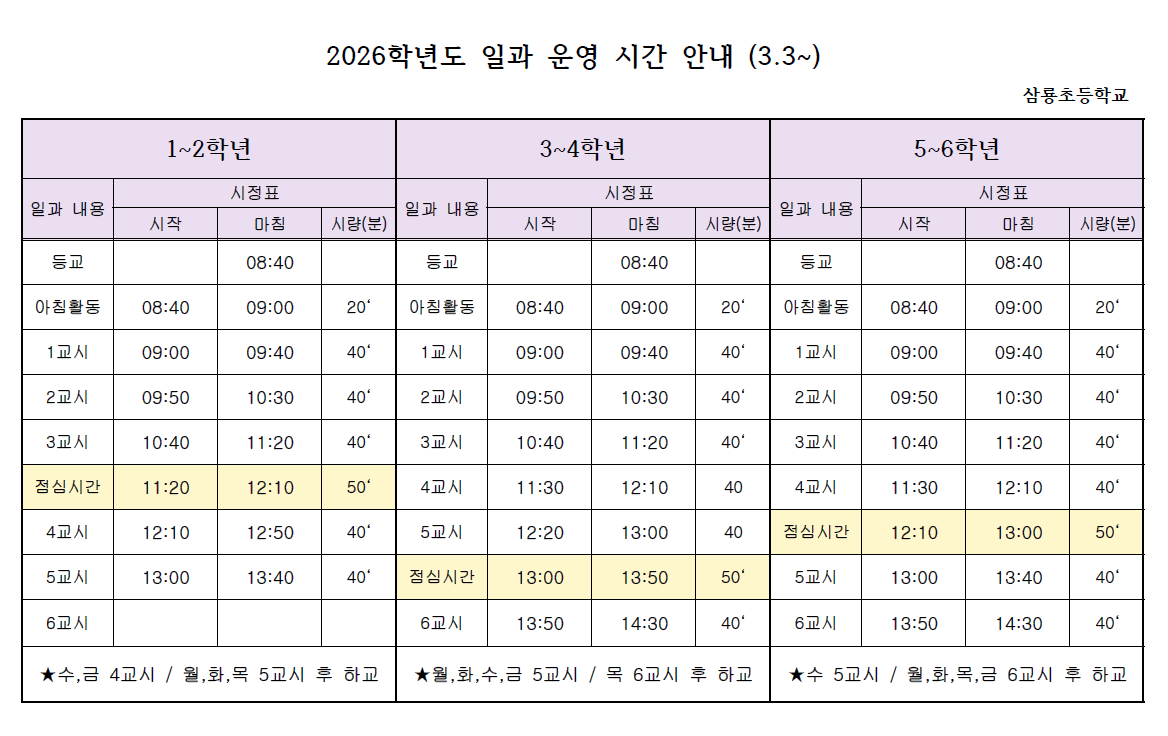 2026학년도 일과 운영 시간 안내
