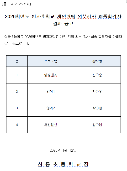 2026. 돌봄·방과후학교 맞춤형 프로그램 외부강사 최종 합격 결과 발표